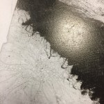 The etching process is still a little unclear for me. I know that we started out of the gate with the issues on the etch. As we applied the etching chemicals, the design started to wipe away. Come to find out I had used the wrong type of marks on the plate. Instead a grease type marker, I had used a stabilo pencil. A misunderstanding on my part of the type of pencil and marks to use in preparing the plate. There were several areas that the etch did not take and certainly did not etch the way it was intended. The etching detail images shows where the etch either did not take or washed away during the etching process.